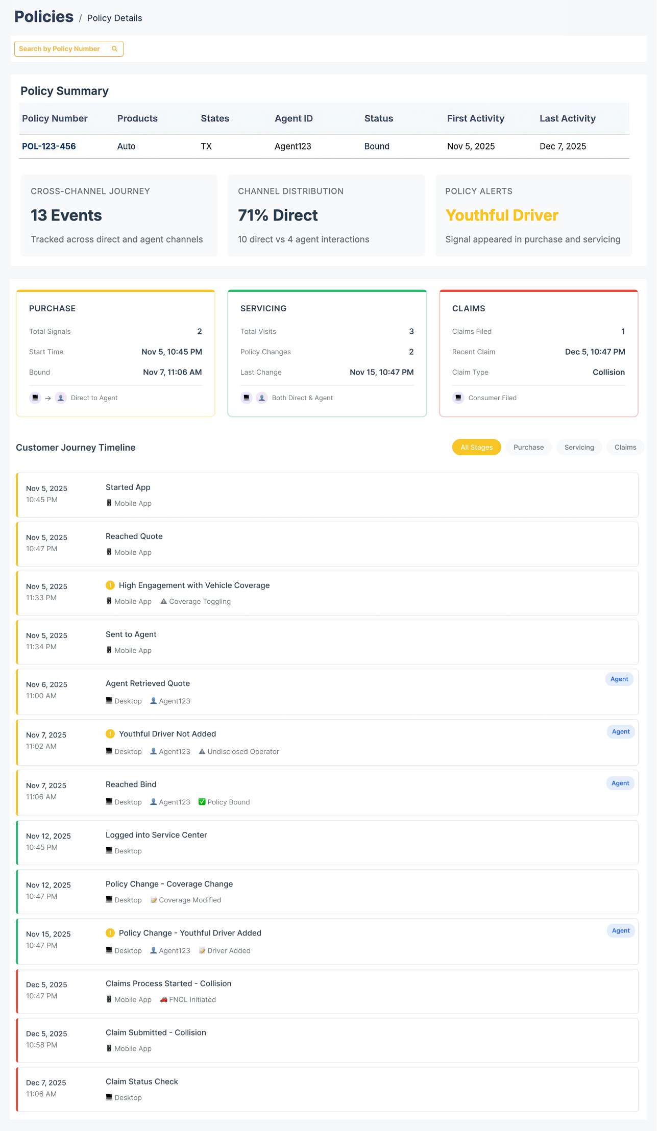 It connects behavioral intelligence across Direct, Agent, Call Center, Endorsements, Claims, and beyond — giving carriers one unified view of how a customer actually navigates the lifecycle of a policy.